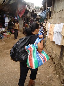 My Mae La camp contacts are Mi Nge and Ruby, a young couple I have known since I stayed in the jungle in 1995 with Mi Nge and her family. They met us outside the bamboo fences that surround the camp. Rick was taking as much video footage he could as the camp came into view. He didn't realize the Thai soldiers patrolling the highway did not want the camp photographed. The camp goes on for miles and there are thousands of homes crowded together at the base of a huge mountain. As you get closer, you can also see homes way up the slopes of the mountain. I always have joked that no matter where you go in the camps, you have to hike uphill, and Mae La is no exception. It was a neat experience for me to see everything through Rick's eyes.