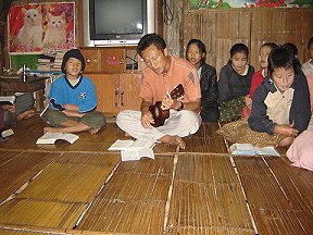 Food rations have been cut and it's a struggle to get enough to feed everyone. Mi Nge told me the border consortium that used to supply rice, yellow beans, salt, cooking oil and fish paste, have now cut out all yellow bean rations and salt is only given every other month. Without the yellow bean and rice combination, they no longer have a perfect source of protein. Ruby told us it costs them 3 baht a day (10 cents) per child to buy the beans from the camp shops. That comes to $5.60 a day, which is a struggle for them with only their meager teaching salaries. Mi Nge said that every 2-3 months they buy enough eggs so that each child can have one egg. When I think of the terrible waste of food in the US, it really is heartbreaking. The boys in charge of cooking the daily rice had built a roaring fire in the cooking area and had a huge aluminum wok filled with water and rice cooking over it. They got the fire too hot and burned a hole in the wok and lost all the water and rice. It broke my heart to see them trying to re-start the fire in the water soaked fire pit. IAG provided Mi Nge with enough money to buy another wok. This young couple's having a tremendous impact on all these children's lives and need all the help we can give them to feed all these children.