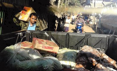 Our driver, Bet Soe, was the same one who had taken us to the camp last year and tried to get us in, to no avail, due to mis-communications with the camp commander. The photo on the left is Bet Soe and I in the market. Below are more photos taken at the open air market including market shelves, a table with a hog's head & raw meat, and one of the truck being loaded.