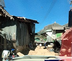 Bet Soe navigated the truck through the narrow roads (left) as far as he could until we came to a narrow foot bridge. He called our camp contact, Daisy, and she said she had forgotten the bridge was so small and said she would come meet us and walk with us to where the children and parents were waiting. Daisy brought several older boys with her and they unloaded the food and suitcases of gifts and clothes we had brought with us. They carried them to our friend Lucky's house so they could be distributed later.