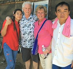 We walked about 2 miles to get to the school room where the children were waiting for us. Rick was really struggling but was determined to persevere. Daisy's father, Lucky, met us on the way and walked with us. I have known Lucky for over 20 years and he is a trusted contact in Mae La camp for us. Daisy teaches at an elementary school and the principal had agreed to let us use one of the rooms for our registration and picture taking. This made it really nice to be out of the hot sun. The first photo on the right shows Rick and I with Daisy and her father, Lucky. The 2nd photo is Rick with Daisy's husband and daughter, Esther Grace.