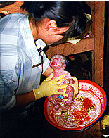 This Newborn Baby was delivered by Dr. Eileen and Dr. Jim in 1997 - Shown here getting a first bath from young Karen nursing student in Kwee Kler Village.