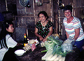 This photo shows Moo Moo (a pastors wife in Mae Rah Moo refugee camp) with Mary Wright of Alabama and a young girl who is helping cook our evening meal.