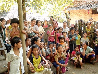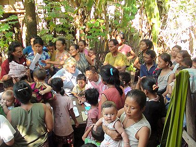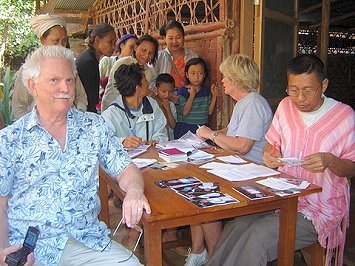 We were greeted by Pastor Thein Thein Aye and taken to the church. He left us with his wife and baby while he went to announce over the camp loud speaker that we were there and that children should start coming right away to be registered and get their pictures taken.We set up a table just outside the church door so we would have good light and people starting pressing close, wanting to make sure their child's picture got taken. For about 2 hours it was organized chaos.