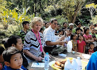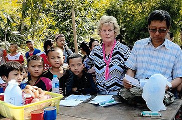 Our special friend, Kyi Aung, ran to meet us and grabbed me in a big hug, all the time talking a mile a minute! When he saw Rick right behind me, he hugged him and made him feel as welcome as I did! We walked about 15 minutes into the camp and he stopped at a clearing at the base of a gently sloping hill. A table and 2 chairs were quickly set up on the flat area and he directed everyone to sit down on the slope.
